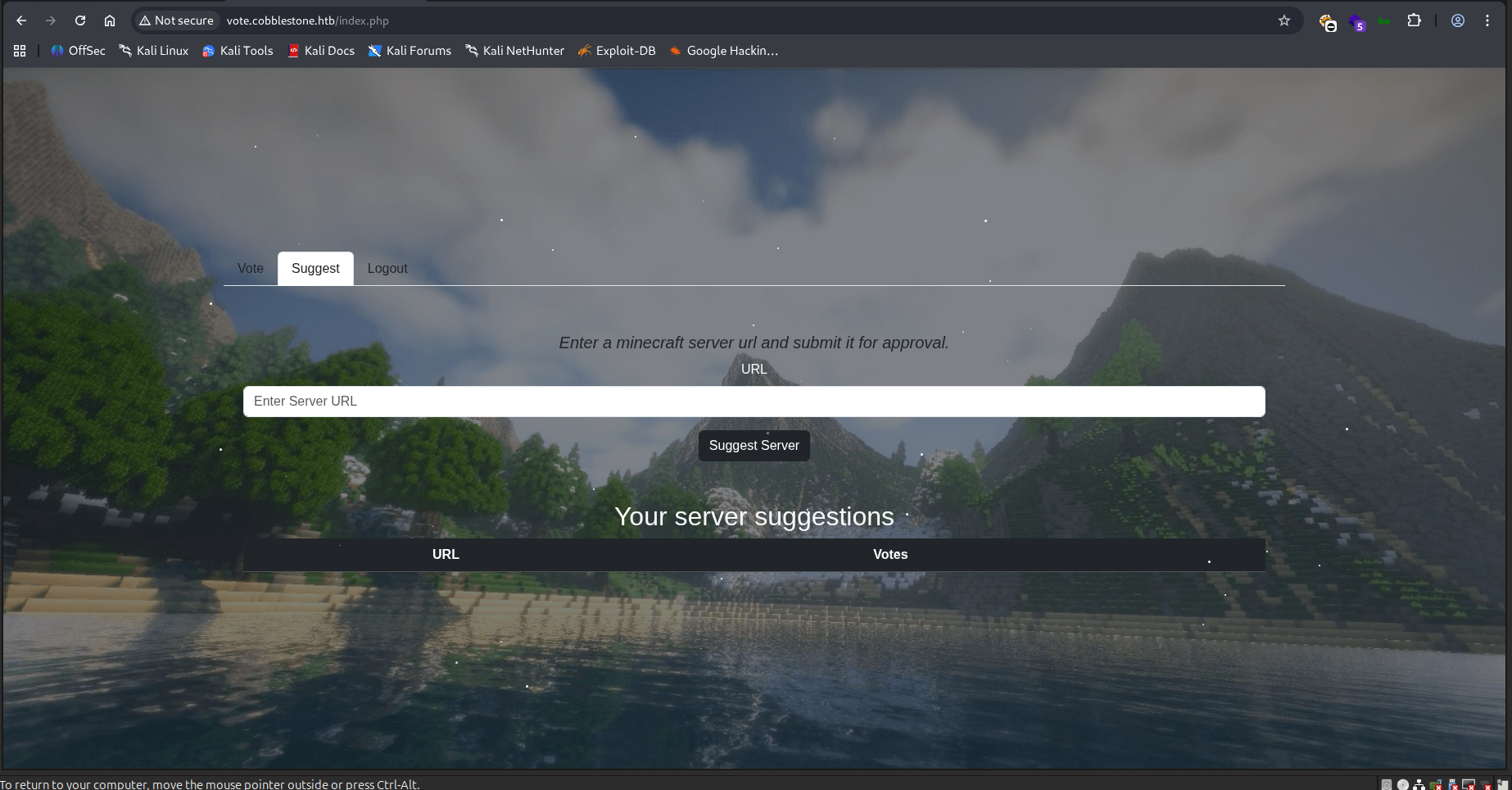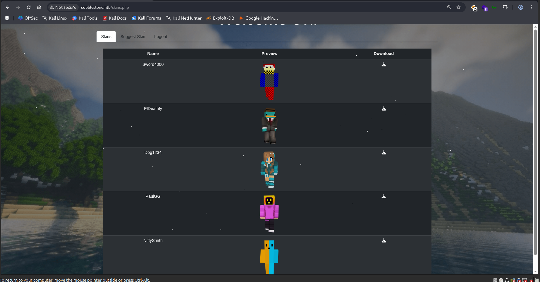 , we find a portal to suggest a Minecraft skin to upload to the website. There are some default skins, I tried suggesting an already existing skin name, with an invalid IP, and it passed through saying that’ll be reviewed by the admin.