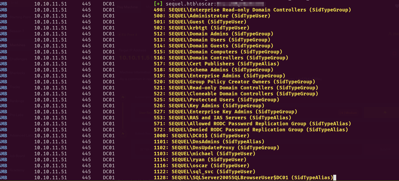 Given the valid credentials of oscar user which I thought were useless, we can indeed brute force the smb service with the valid creds we had from the beginning **WITH THE PASSWORD WE JUST FOUND**. So after adding the new entries to the users and passwords files we run:
