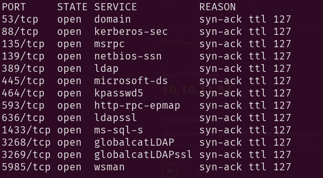 When facing windows machine, before I execute any Nmap scripts I like to list the ports first, to have an idea about the protocols and services in use to map it in our mind a bit so that the output of the scripts won’t be confusing later or I don’t miss out anything useful. So I run: