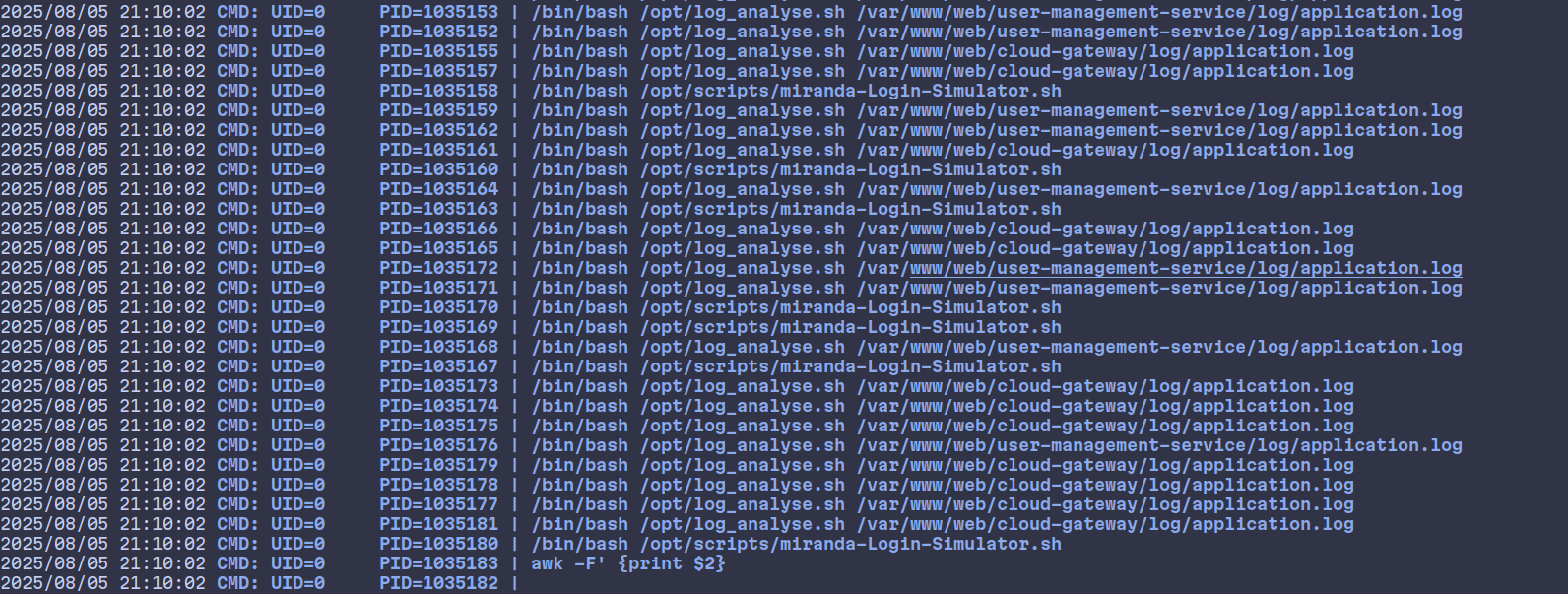 2025/08/05 20:18:03 CMD: UID=0 PID=986621 | /bin/bash /opt/log_analyse.sh /var/www/web/cloud-gateway/log/application.log